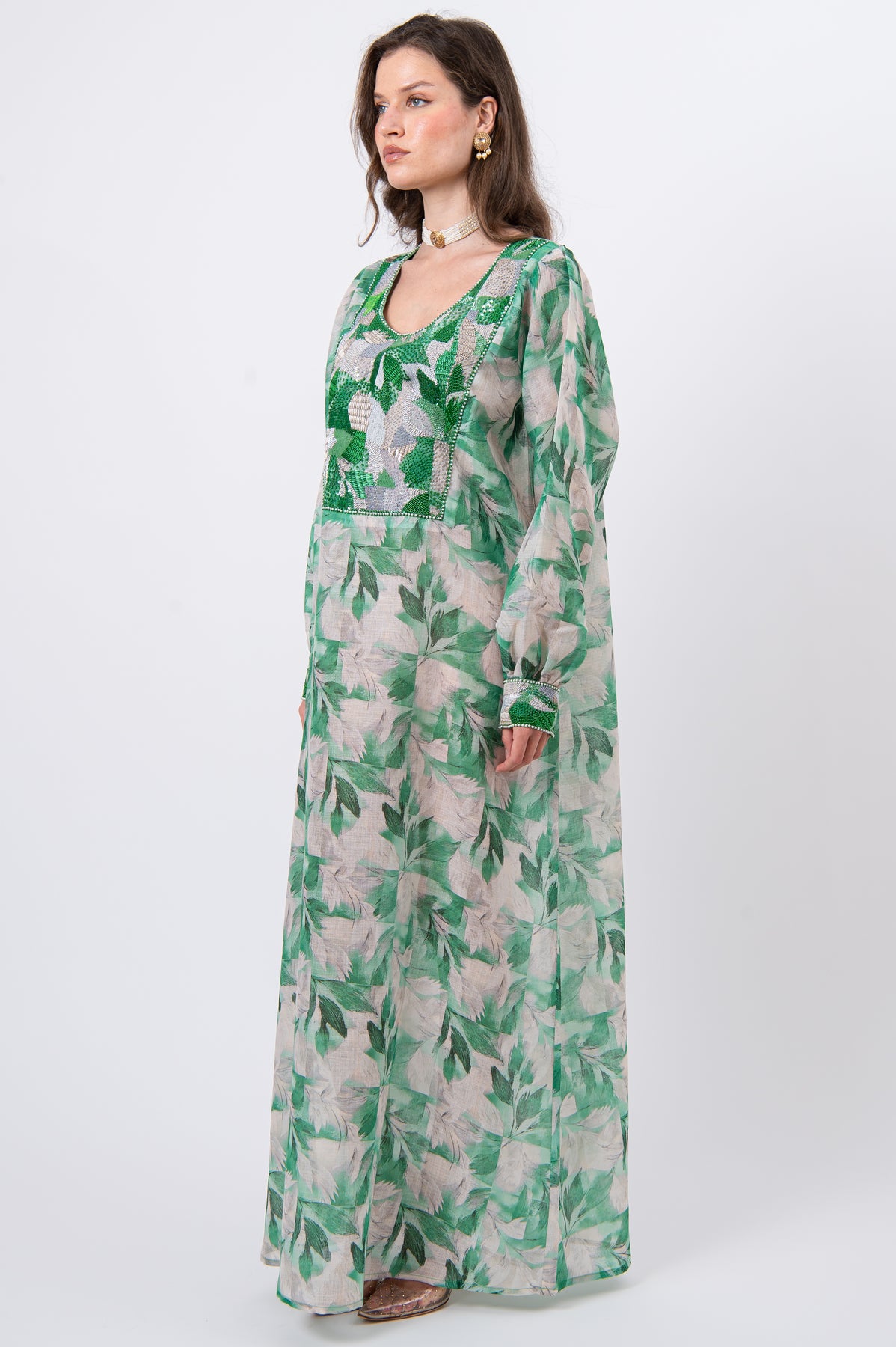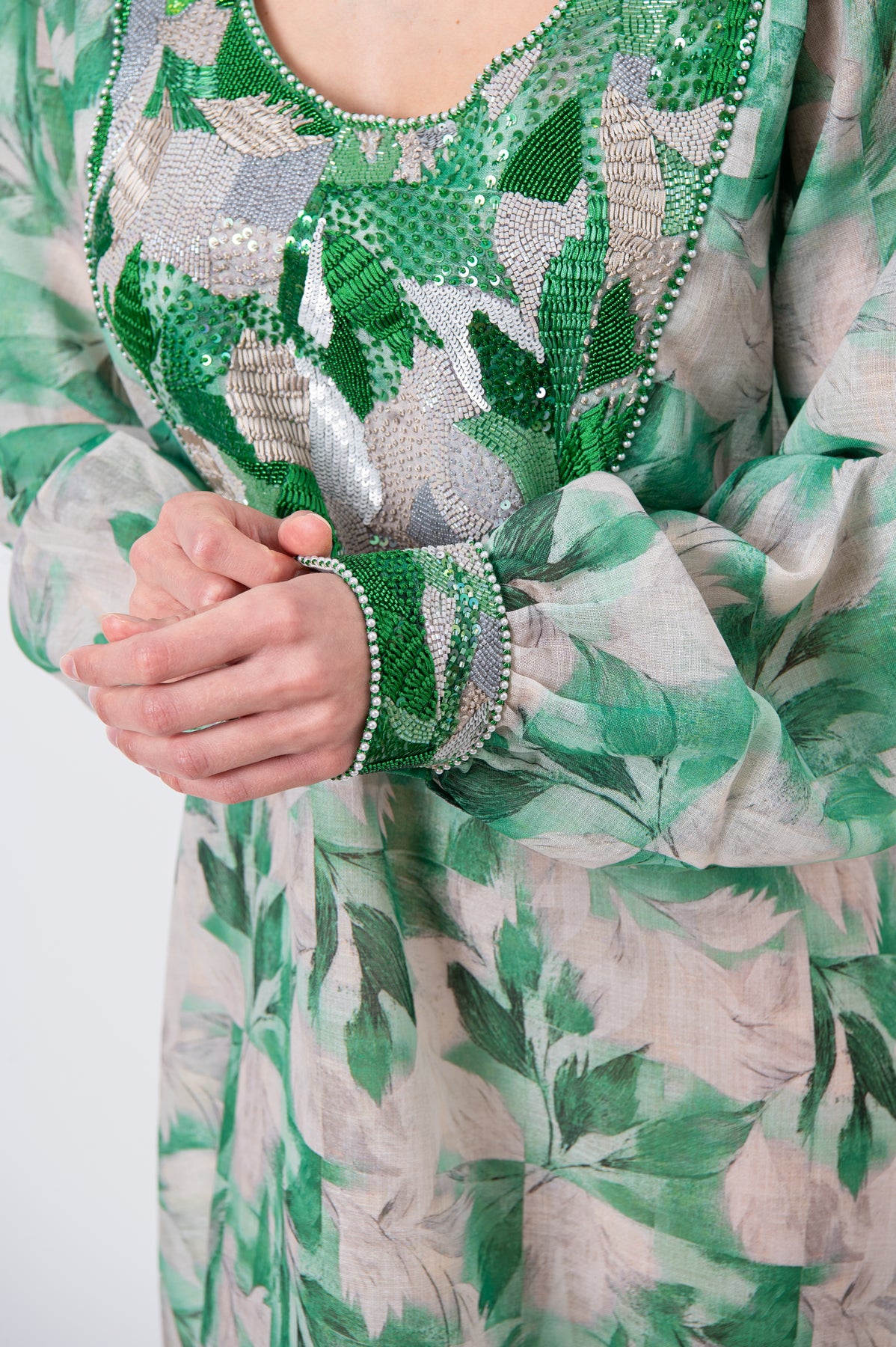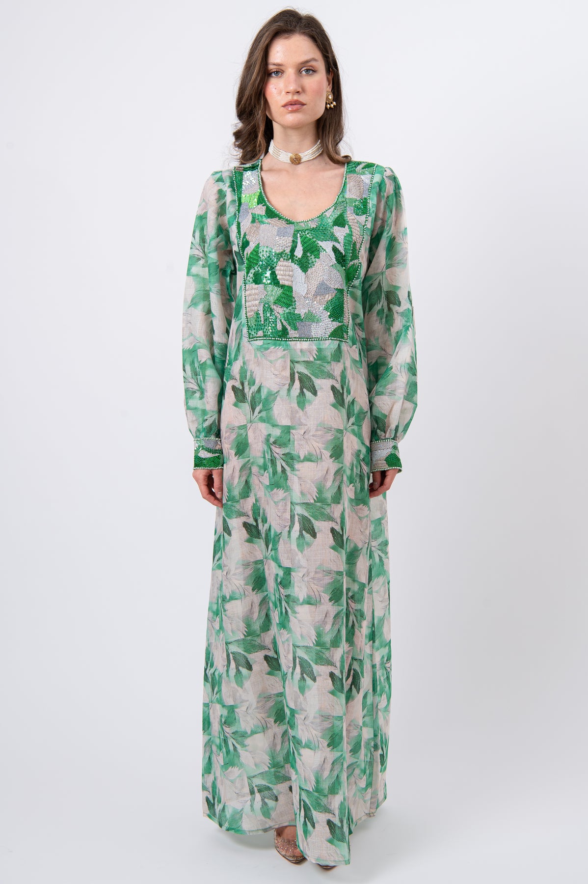 Indulge in understated elegance with this statement kaftan, crafted from premium natural linen for a refined yet breathable drape. Rendered in sophisticated green tones, the design is richly adorned with intricate hand embroidery combining fine threads, shimmering sequins, and delicate crystals in a unique artisanal composition. Finished with a classic round neckline, this kaftan flows effortlessly—making it ideal for elegant daytime wear and distinguished special occasions.