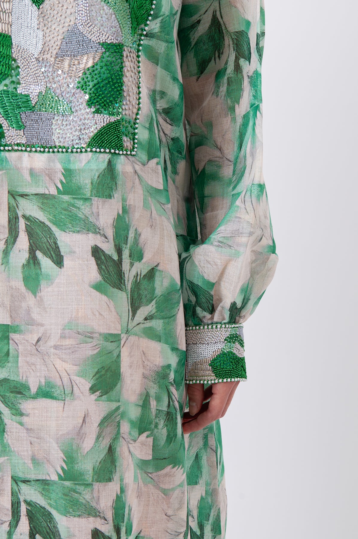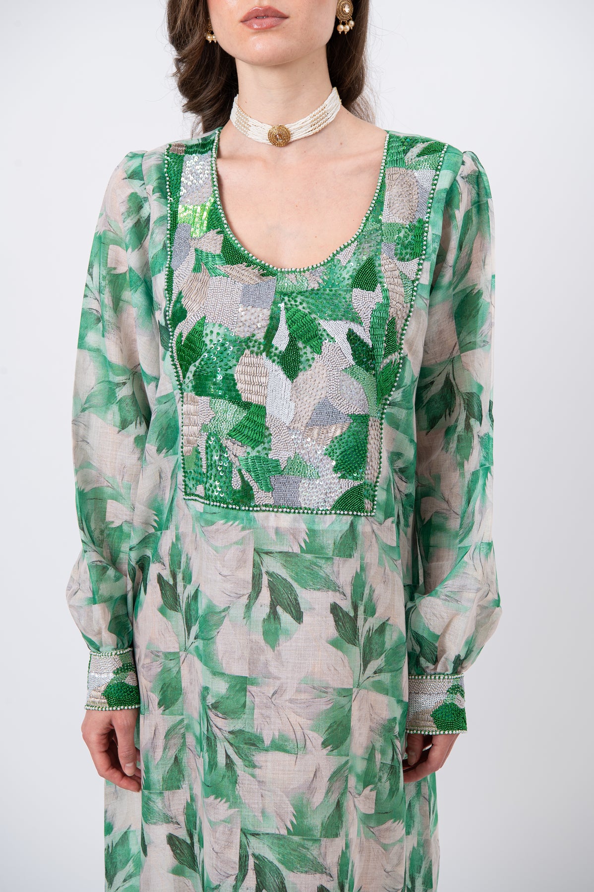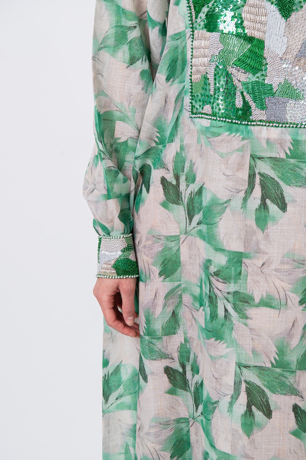 Indulge in understated elegance with this statement kaftan, crafted from premium natural linen for a refined yet breathable drape. Rendered in sophisticated green tones, the design is richly adorned with intricate hand embroidery combining fine threads, shimmering sequins, and delicate crystals in a unique artisanal composition. Finished with a classic round neckline, this kaftan flows effortlessly—making it ideal for elegant daytime wear and distinguished special occasions.